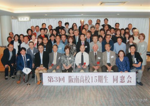 『還暦記念 第3回 15期生同窓会』を道頓堀ホテルで開催しました。恩師の植栗、三木、岩橋、河野、前田、武田、別所各先生方をお迎えしました。実行委員会で手分けして同窓会のお誘いを広げていくことで、生徒135名と多数の参加がありました。卒業後、初めて参加する方にも喜んでいただけました。一次会では、第3回と回を重ねているので、どのテーブルでも打ち解けて話が弾んでいました。