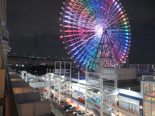 船に帰ってきてしばらくしてベランダに立っておりましたところ、船の出航時間が来たみたいで、船が岸壁をゆっくり離れるような感じがしました。その時にどこかから綺麗な合唱が聞こえてきました。聞いていると日本語のような歌だったんですが少し離れていたので何を言っているのかよく聞き取れませんでした。船の中央部分当たりの岸壁からどうも若い5-6人の男女の方たちがマイクを使ってバックの音楽と合わせて歌っておられたんですがとても素敵な歌声でしばらく聞きほれていました。何かロマンス映画に出てくるような切なくて悲しい別れの歌声の様に私には聞こえました。あたりは暗くなっていて、綺麗な歌声が響き渡りその後ろにはキラキラと電光で光る大観覧車があり、ほんとにロマンチックな別れになって目頭が少しうるんでくるような気持になりました。後にも先にもこういう切なくて悲しい別れは大阪でしかありませんでした。