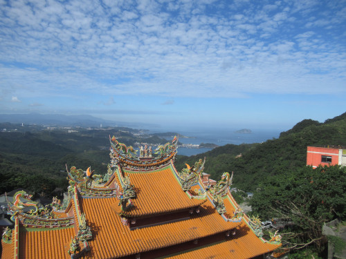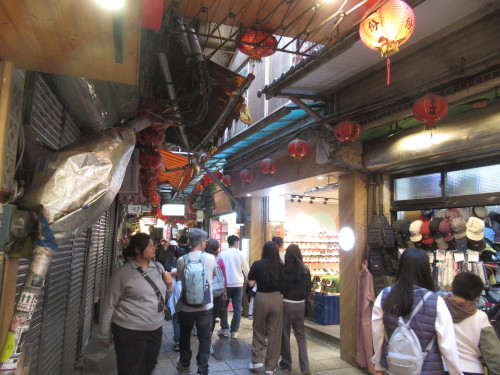 軽く朝食をみんなで食べた後基隆で有名な観光地のジウフェンというところに向いました。後で解ったんですが、何か山の上にある古い街みたいなところでした。車は基隆港を後にして海岸沿いにある道路を少し走りそれからだんだんと山の上の方に上がっていきました。山の中の道路は結構狭く片道一車線でまたそこを市バスとか観光バスも通るので歩くのには少し危険なような感じがしましたが結構多くの方たちが歩いておられました。山の中腹ぐらいについて皆車から降りて、すこし坂を下った所にあった通りの入り口みたいなところから長く続いていた商店街に入っていきました。