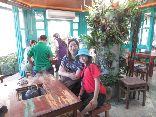 狭い道の両側に小さなたくさんのお店が出ていてまたその道を非常にたくさんの人たちが通るので、とても混んでおりました。お土産さん、食べ物やさん、飲み物やさん、とにかく通りはたくさんの人達でとても混んでおりました。通りの突き当りの所で台湾スタイルのティーハウスがあるというので娘たちの後をついていきますと、格式のある昔からのお茶屋さんみたいな感じで、お店の裏にあるティーハウスの別館に移動しました。係りの人の案内で椅子に座り、台湾式のティーセレモニーをしていただいて、それから台湾茶をみんなで楽しみました。日本の様にセレモニー自体は難しくなく、簡単なものでしたがみんなで台湾茶と甘いお菓子を頂いて、満足しておりました。ティールームにはテーブルが5つほど備えらえていて、結構たくさんの人たちが台湾茶を楽しんでおらえました。ちょうど私たちの隣に座られていたグループは愛知県から来られていて人達でした。担当の人も台湾語のほかにも結構上手な日本語で、お客さんに対応されていました。