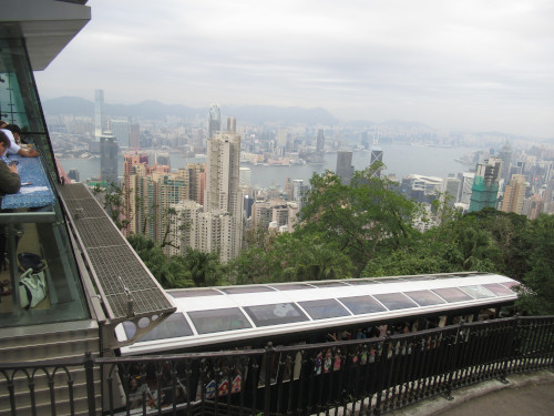 ついた駅が超近代的な駅で、中はショッピングモールのような感じになっていました。駅の周りは観光客で満員でした。皆さん駅の中で食事をしたり、外で写真を撮ったり、結構にぎやかな所でした。それにしても駅の周りはどこでもごみひとつ落ちてなくて非常に綺麗に整備されていました。外に出てみると目の下にたくさんの高層ビルが見えました。又はるか向こうの対岸の九龍にあった高層ビルも見られて香港は本当に超高層ビルの街だなと感じました。ビクトリアピークは夜警がとても有名ですが我々がついたときはあいにく薄曇りでお昼の3時ごろだったので、ビクトリアピークから見る夜警は楽しめませんでしたがここから見る香港の景色は大変素晴らしい物でした。
