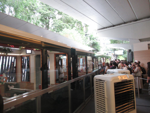 そうこうしているうちに坂のあたりに来て車が止まり、皆で歩いてすぐそばにあったビルの中に入って行ったんですが、これはどうやらケーブルカーの乗り場の様でした。昔のケーブル―カーの模型とか置いてありました。正確な名前はビクトリアピークトラムと言われているみたいです。このケーブルカーでビクトリアピークまで登るみたいでした。しばらくすると、緑色をしたかなり大きなケーブルカーが駅に入ってきました。ケーブルカーに乗るなんて何十年ぶりでしょうか?ケーブルカーは満員でゆっくりと山を登って行ってしばらくすると頂上に着きました。